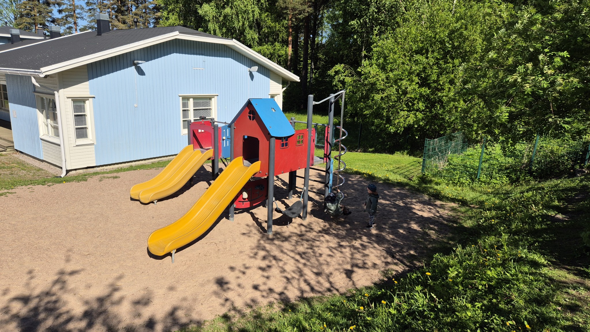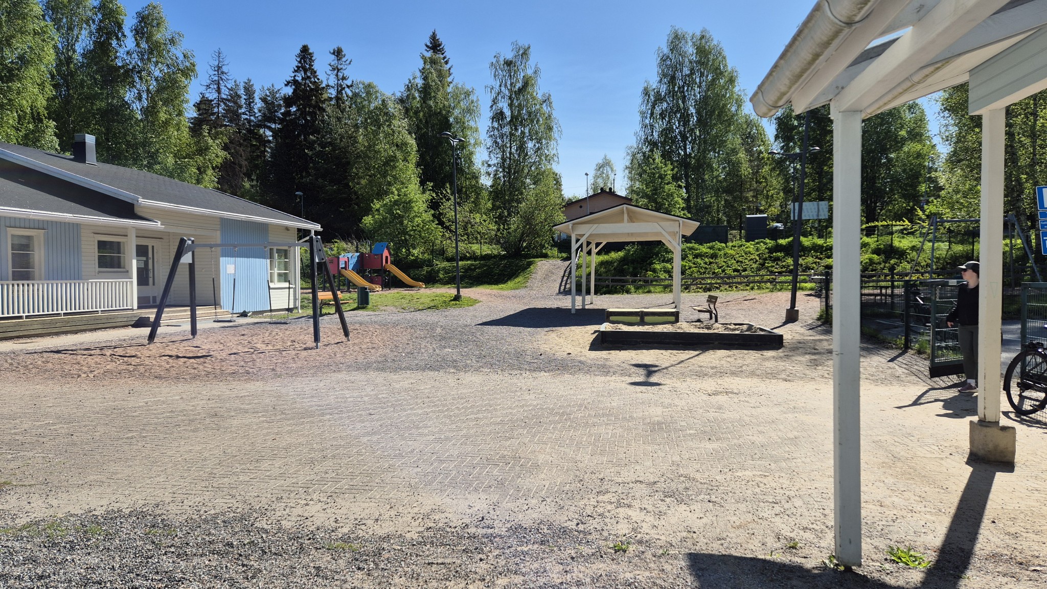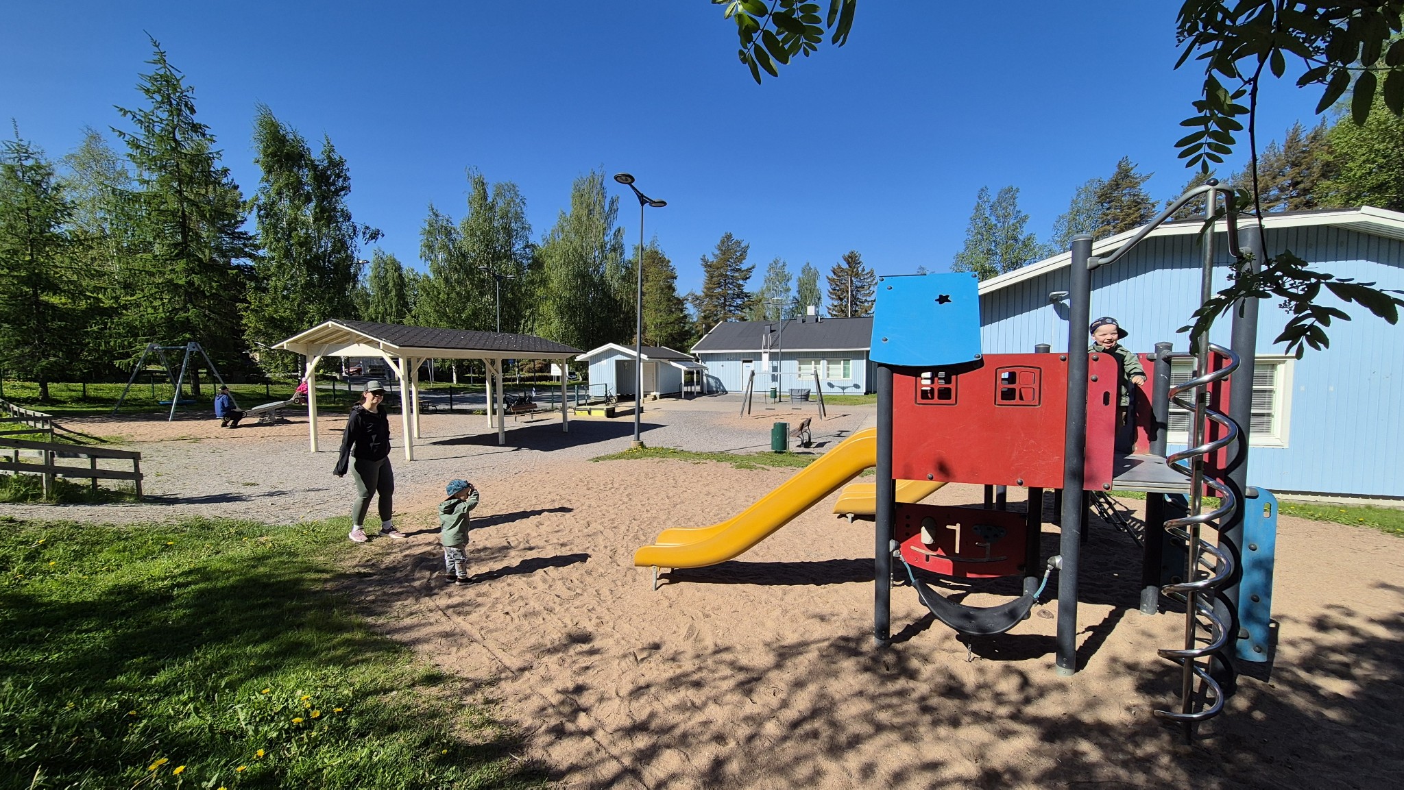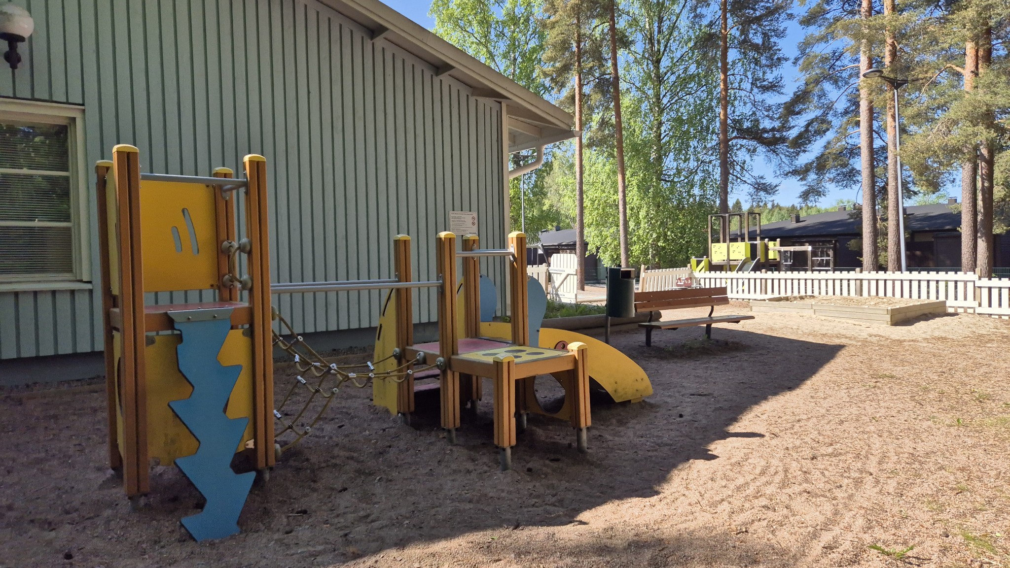 Huutijärven päiväkodin piha on sympaattinen ja rauhallisen oloinen leikkipaikka, joka koostuu kahdesta rakennuksen eri puolella olevasta leikkipihasta. Yläpihalla löytyy mm. tuplaliukumäki, kiikku ja hiekkalaatikko, joista suurin osa uusittu vuonna 2020. Molemmilta pihoilla on väljyyttä ja löytyy myös varjoja. Alapiha on hieman isompi: löytyy ajoneuvoa ja isompaa liukumäkeä ja vähän puustoa. Yhdessä päiväkodin pihat ovat monipuolinen ja laaja kokonaisuus. Harmi vaan, että pihat toisistaan täysin erillisiä, mikä pakottaa koko seurueen siirtymistä puolelta toiselle yhtä aikaa.