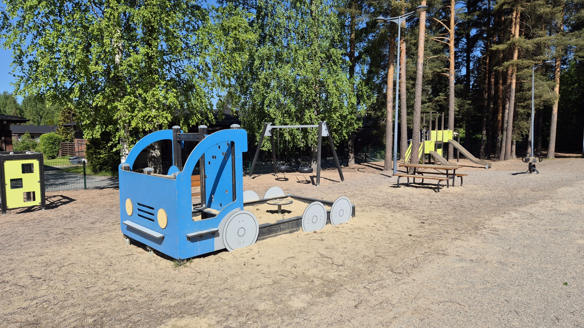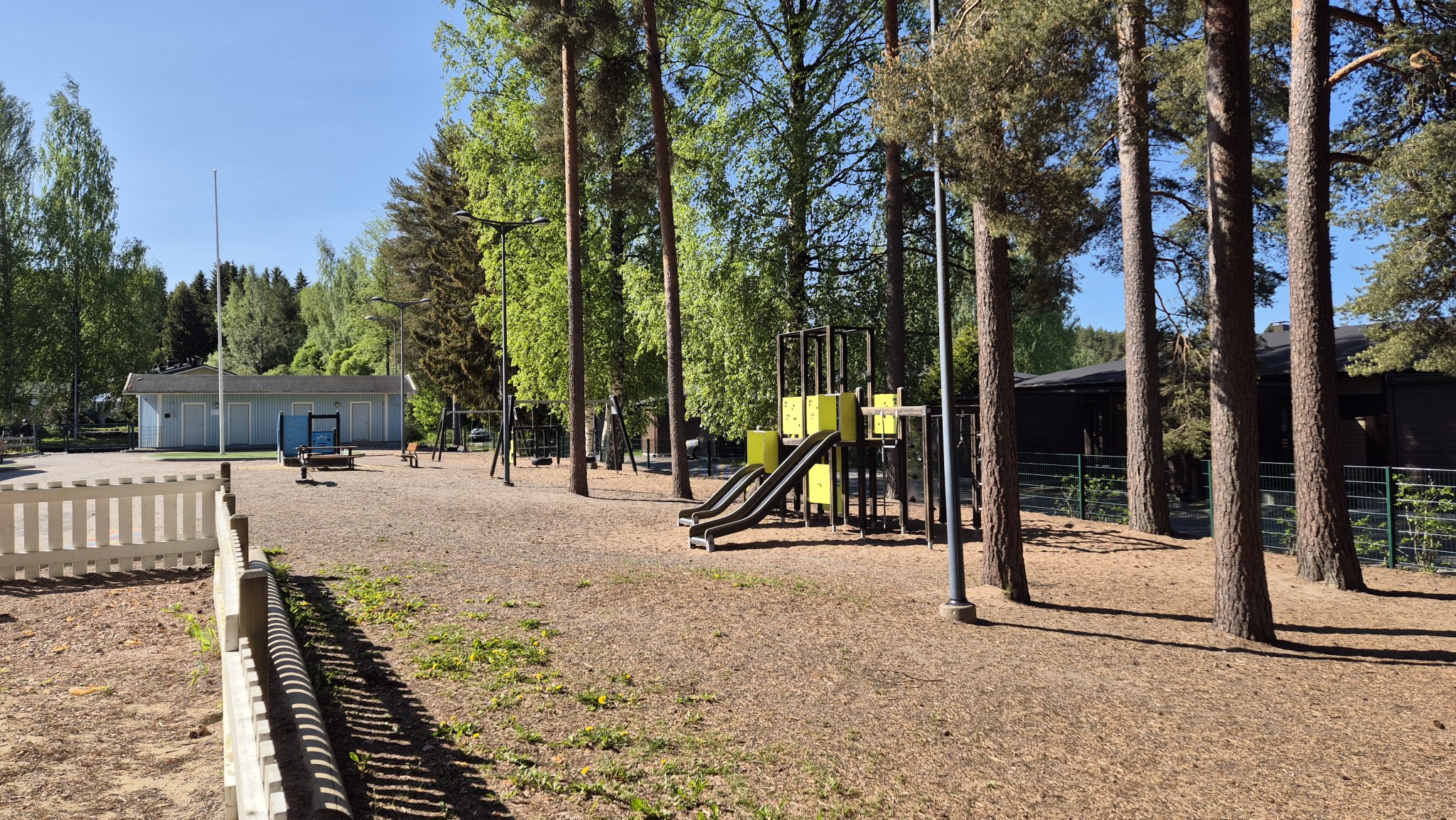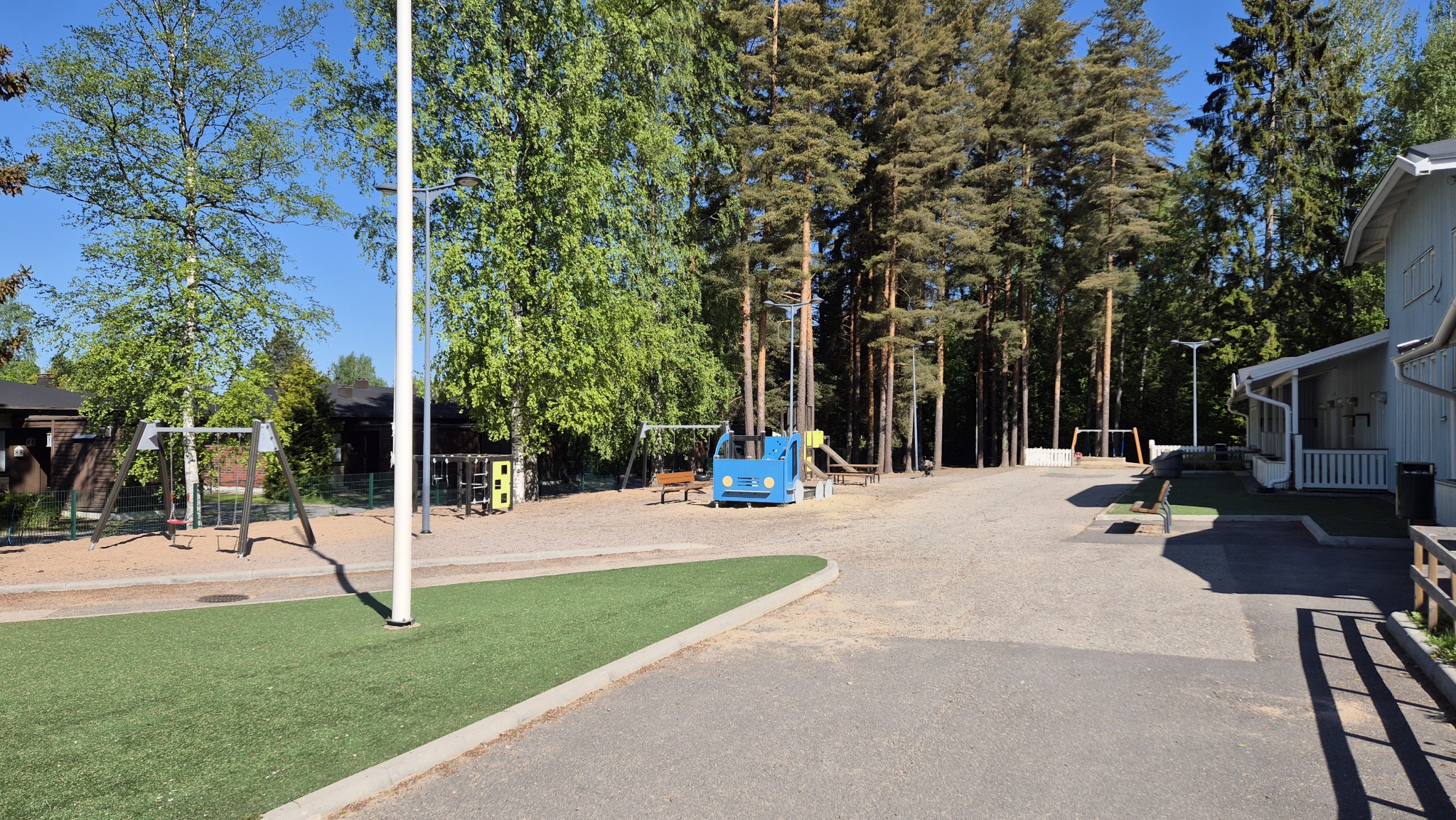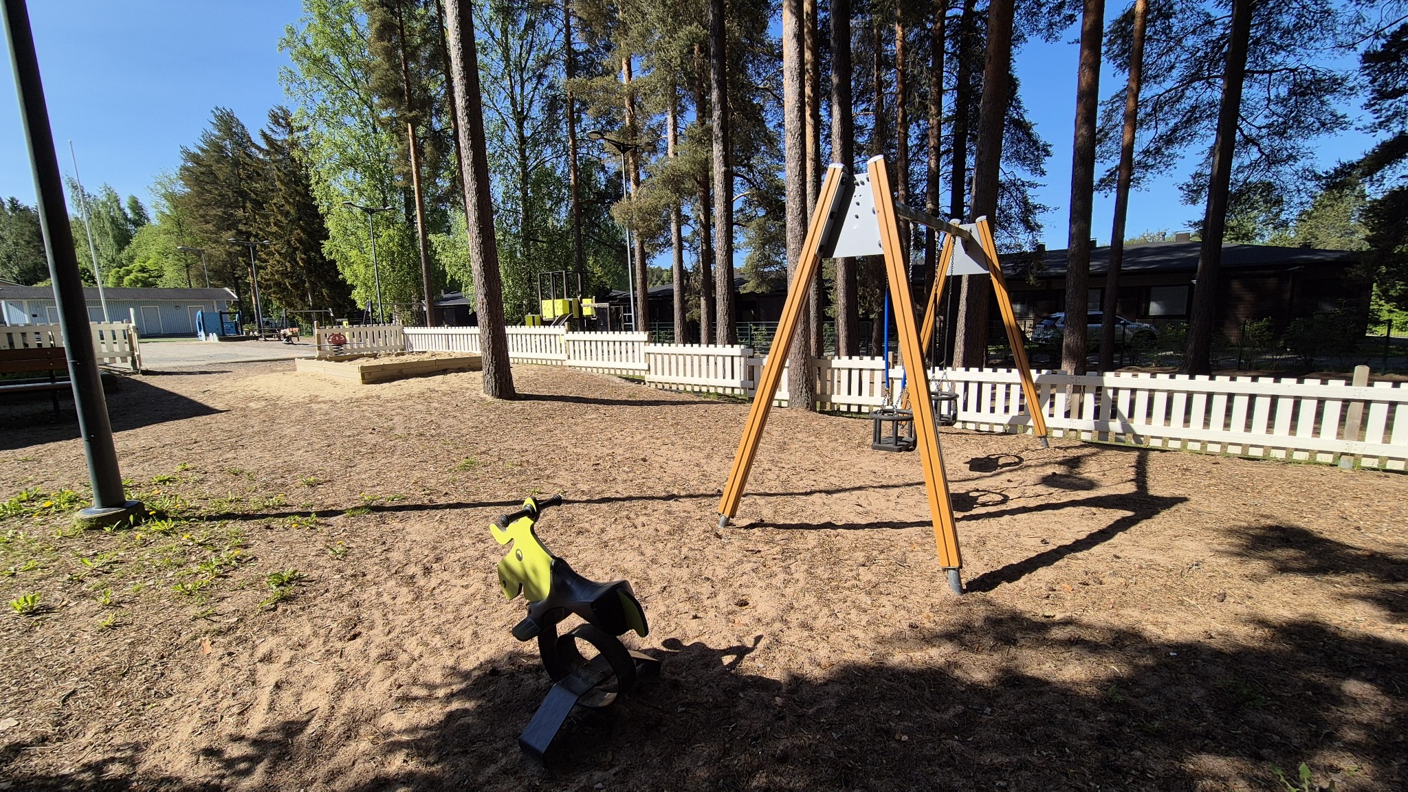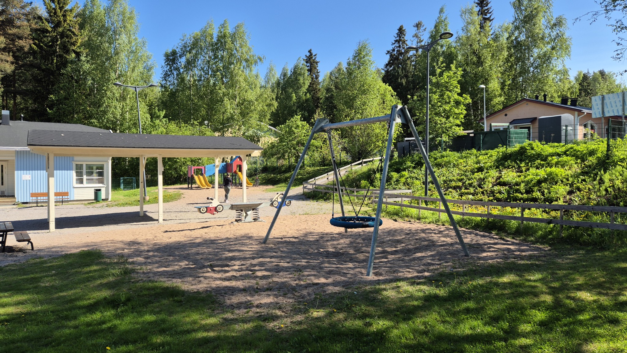 Huutijärven päiväkodin piha on sympaattinen ja rauhallisen oloinen leikkipaikka, joka koostuu kahdesta rakennuksen eri puolella olevasta leikkipihasta. Yläpihalla löytyy mm. tuplaliukumäki, kiikku ja hiekkalaatikko, joista suurin osa uusittu vuonna 2020. Molemmilta pihoilla on väljyyttä ja löytyy myös varjoja. Alapiha on hieman isompi: löytyy ajoneuvoa ja isompaa liukumäkeä ja vähän puustoa. Yhdessä päiväkodin pihat ovat monipuolinen ja laaja kokonaisuus. Harmi vaan, että pihat toisistaan täysin erillisiä, mikä pakottaa koko seurueen siirtymistä puolelta toiselle yhtä aikaa.