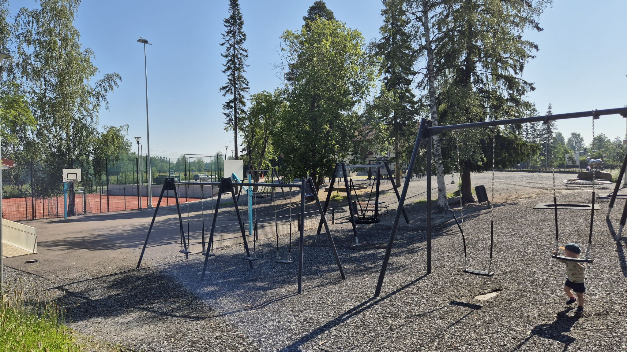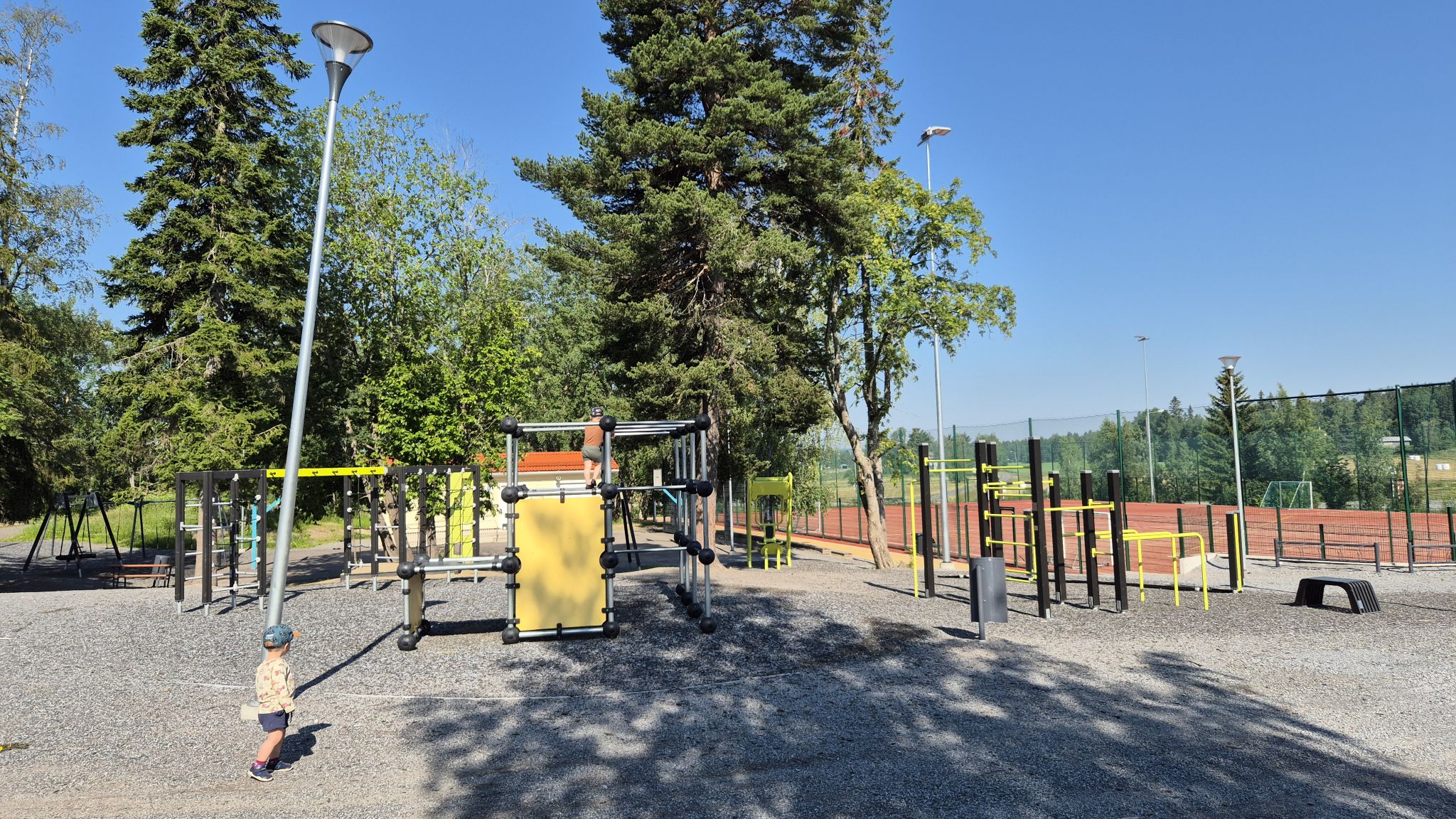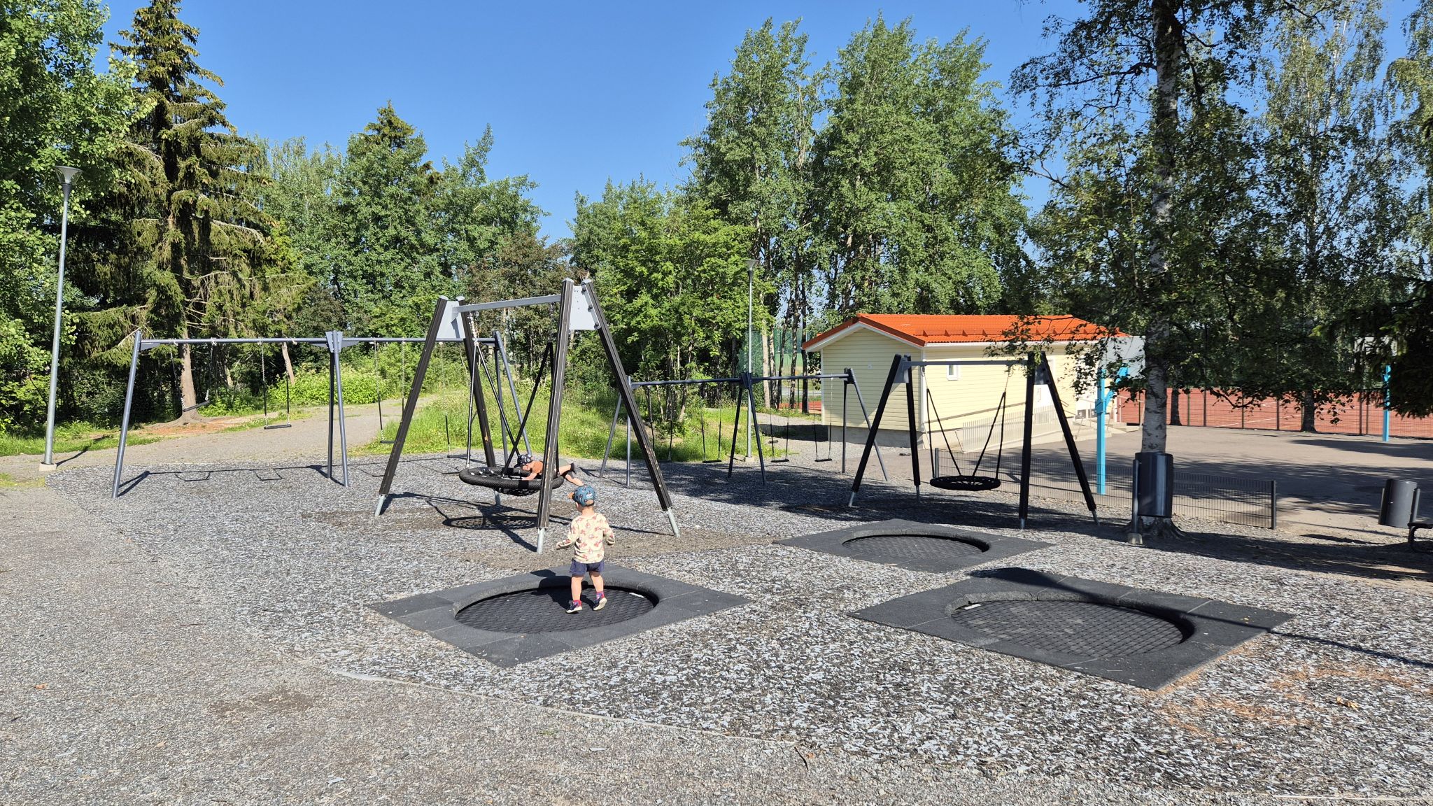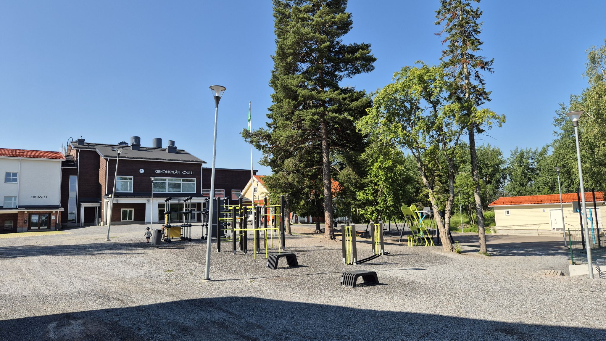 Pirkkalan Kirkonkylän uusi hirsikoulu on valmistunut vuonna 2023 ja pihat ovat myös samalla uudistettu. Leikkimiseen on tarjolla lähinnä kiikkuja ja kiipeilyelementtejä sekä muutaman trampoliini. Oheisaktiviteettina pieni ulkokuntosali, koripallokorit ja tekonurmialue. Vierestä löytyy myös kirjasto. Tarjolla siis monipuolinen kohde.