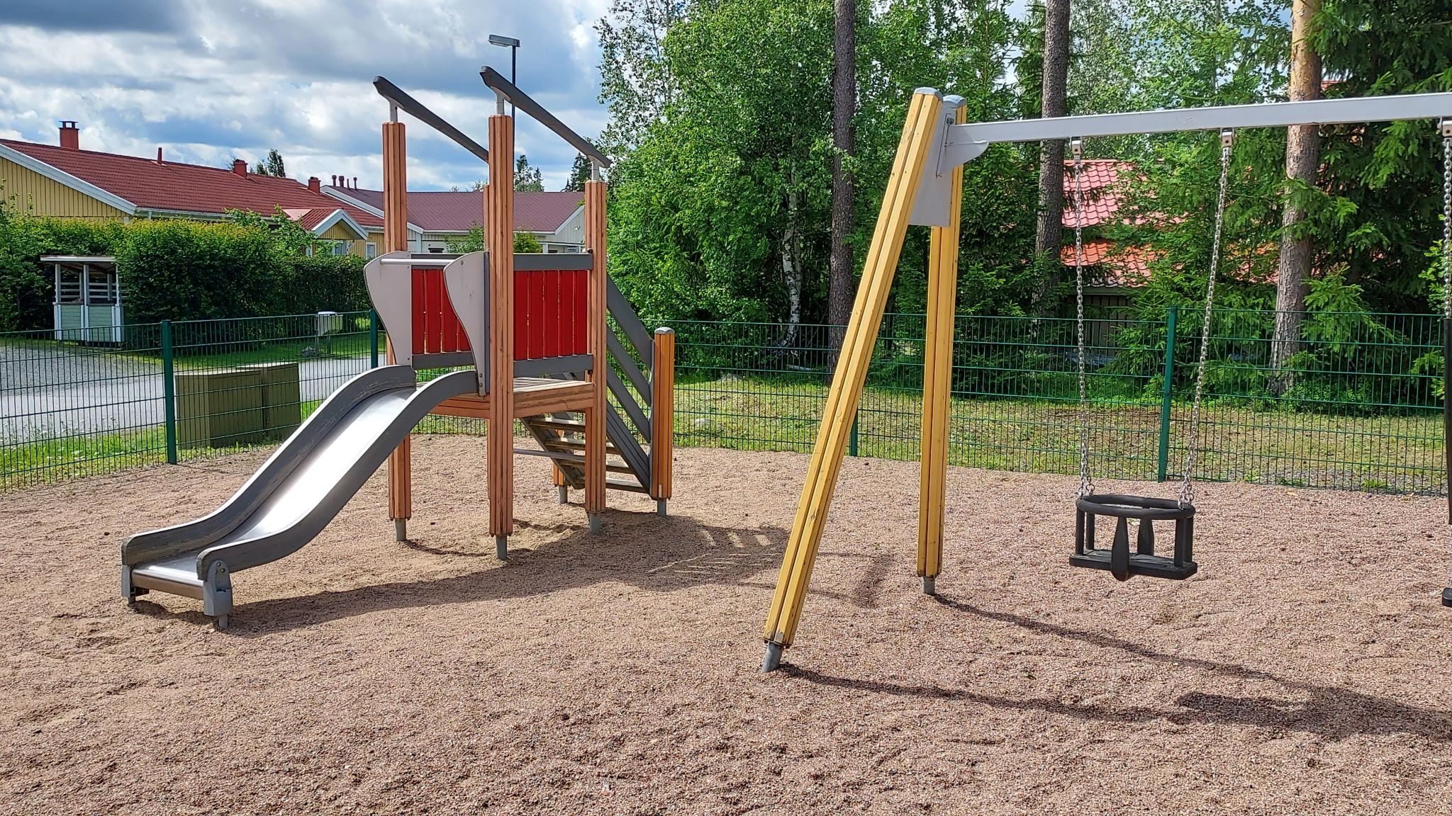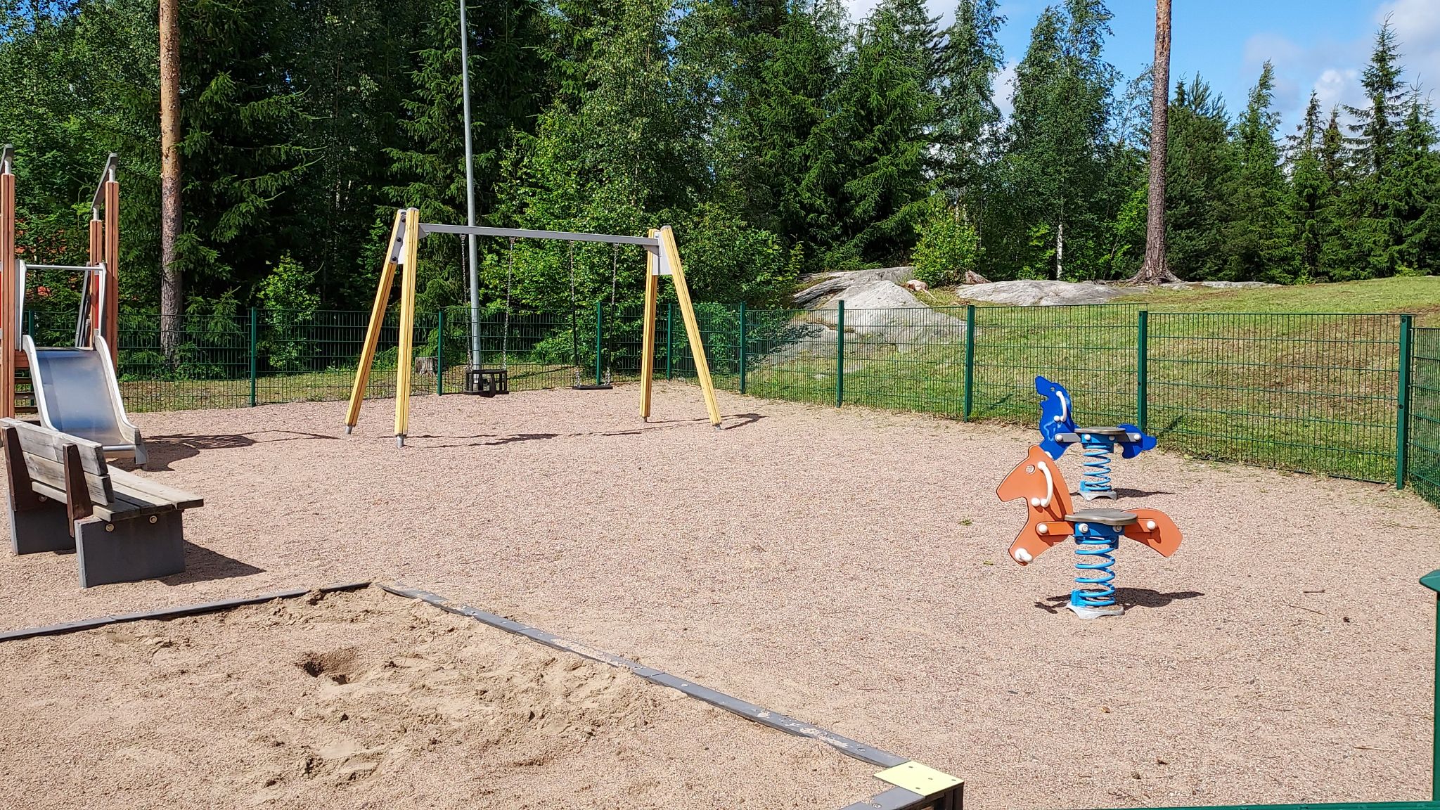 Pieni, asuinalueen yhteydessä oleva leikkipuisto, joka sopii parhaiten 2-4 vuotiaille. Hiekkalaatikko, pieni liukumäki, keinut (1kpl vauvakeinu, 1kpl lautakeinu) ja kaksi heiluvaa ’eläintä’. Erittäin siistissä kunnossa. Täysin aidattu, mutta varjoa ei lainkaan. Hyvä puisto esim. lenkin lomassa leikittäväksi.